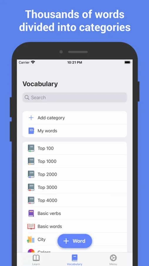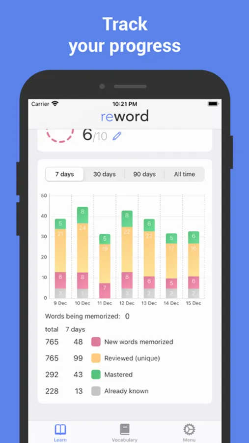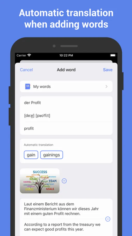 • Statistics: track your performance in learning German words for the last week, month, three months and the last year.