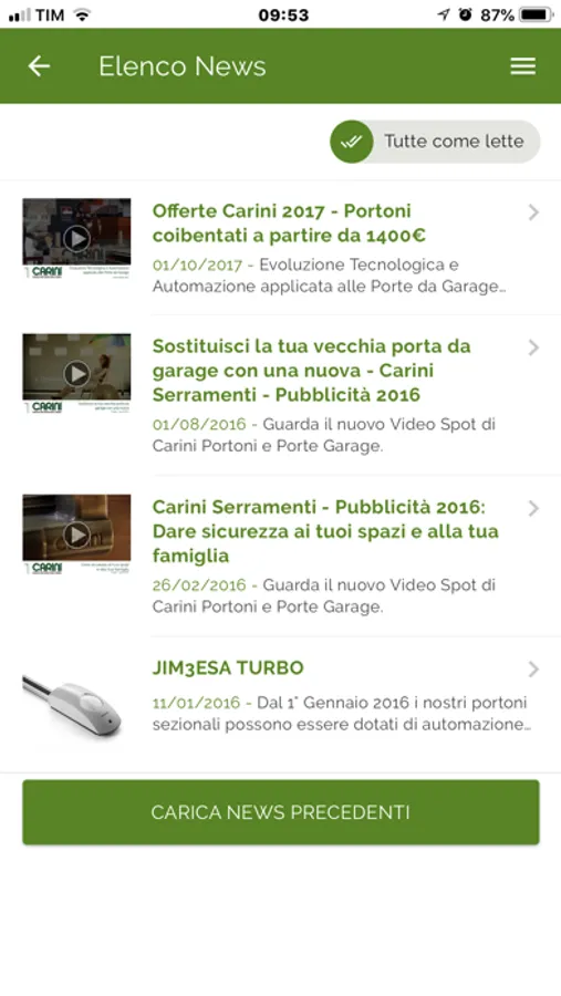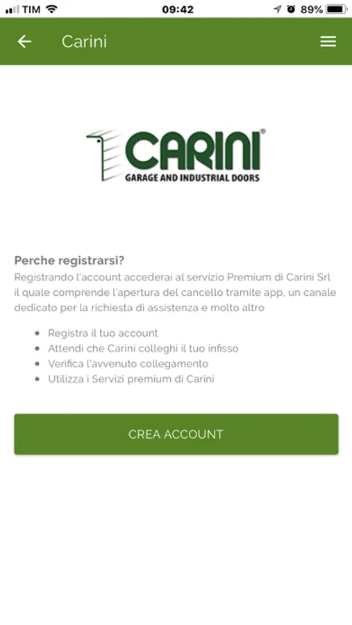 L'app per rimanere aggiornato con le ultime news e offerte di Carini Porte Garage. Inoltre registrando un'account potrai disporre dei servizi premium come il canale dedicato per le richieste di assistenza e la possibilità di aprire la tua porta da garage e il tuo cancello direttamente con il tuo smartphone.