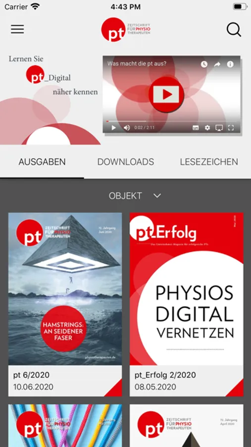 „pt Zeitschrift für Physiotherapeuten“ wendet sich an Physiotherapeuten und Interessierte anderer Berufsgruppen. Sie ist unabhängig, verbandsneutral und informiert praxisnah, aktuell, umfassend und kritisch. Die Rubriken „Dialog“, „Nachrichten & Menschen“, „Politik“, „Therapie“, „Forschung & Evidenz“, „Lehre“ und „Service“ versammeln Fachartikel, Originalarbeiten, Interviews, Berichte, Reportagen und Branchennews. Viele Inhalte sind multimedial gestaltet und crossmedial über das pt Portal und soziale Medien wie facebook und YouTube verbunden.