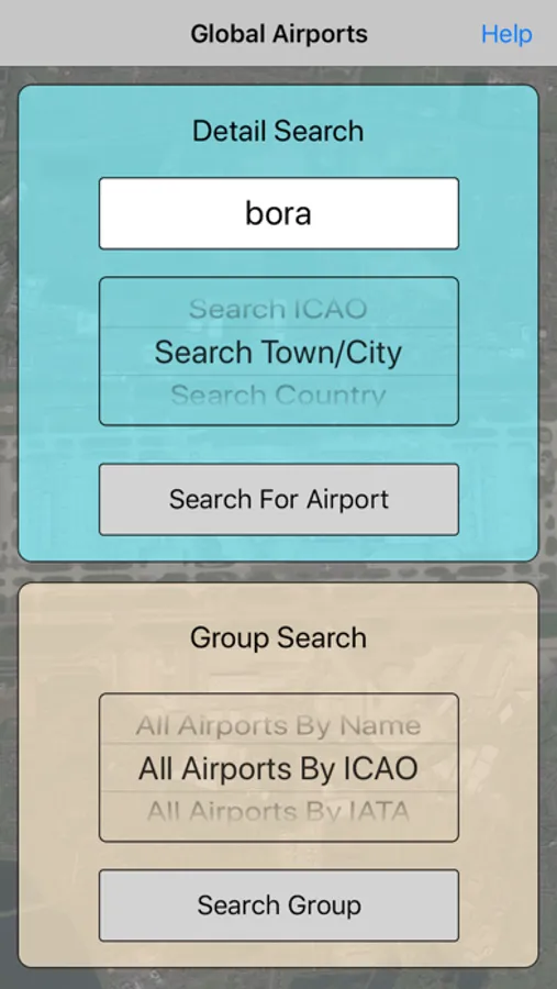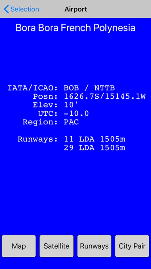Fields can be searched individually without the need to employ wildcard characters or some useful group searches are already supplied. Where runway information is published the threshold Lat/Long coordinates for each runway can be viewed on a satellite image of the airfield. In map or satellite view the airport 'tower' or runway 'windsock' markers may be touched to reveal the precise Lat/Long coordinates. For the interest of the enthusiast this database also contains locations of historically significant civil and military airports that are now closed.