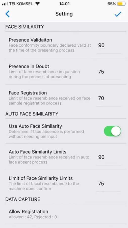 The next menu is an important menu for recording attendance data on every installed application. The "Settings" menu includes the Acceptance During Presence" limit of the sample value matching to be declared valid, "Acceptance During Registration" of the average matching limit of the sample with the new sample being added, Turn on GPS" set of apps running only with active GPS in the device and many other things. Which lets you set the recording application to run in situations where conditions apply.