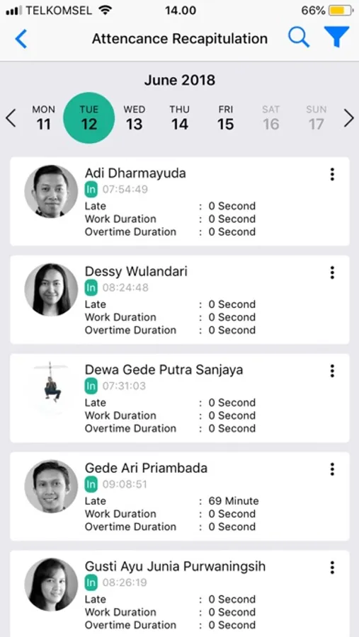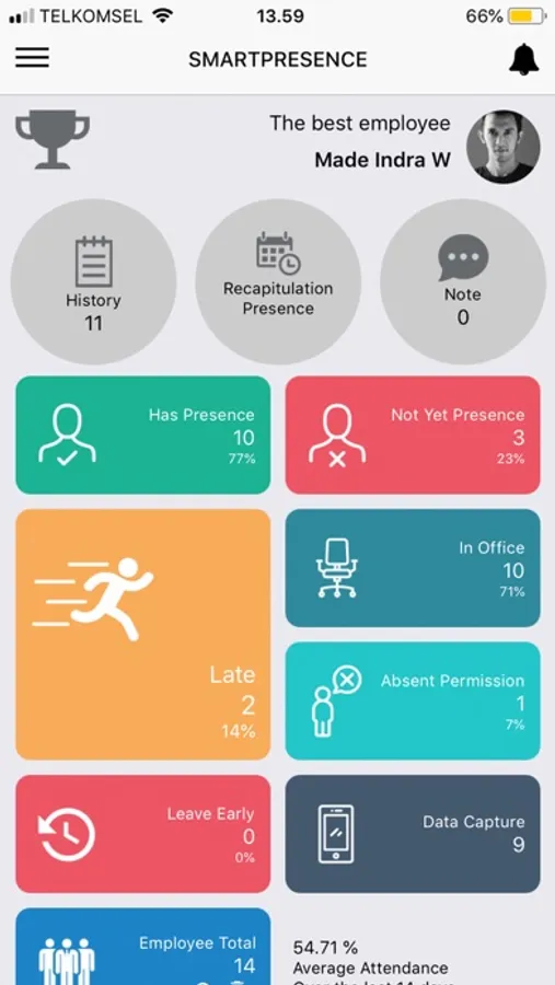 The Dashboard app allows time and attendance tracking and scheduling more faster & effective, and course access from anywhere & anyplace. The attendance insights displayed on the first page of the app provide a full picture of attendance data on current day. Displays "Already Check", "Not Yet Check", "Late", "At Office", "Leave Early", "Absent Permit", "Data Capture", attendance infograph & location when processing attendance. Any such information can be traced in more detail to display employee data within the group of information as well as to move backward & forward date. Each employee data node has profiles details, history (time card / log) & attendance summary(timesheets).