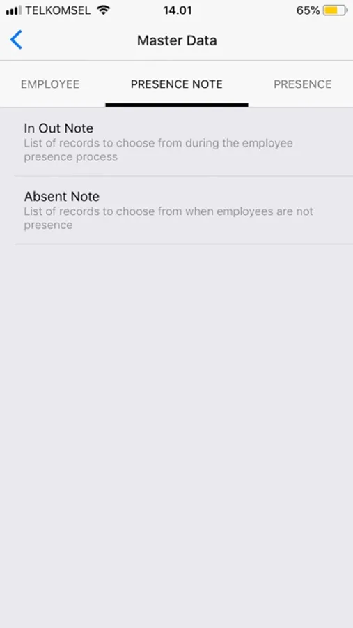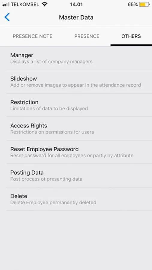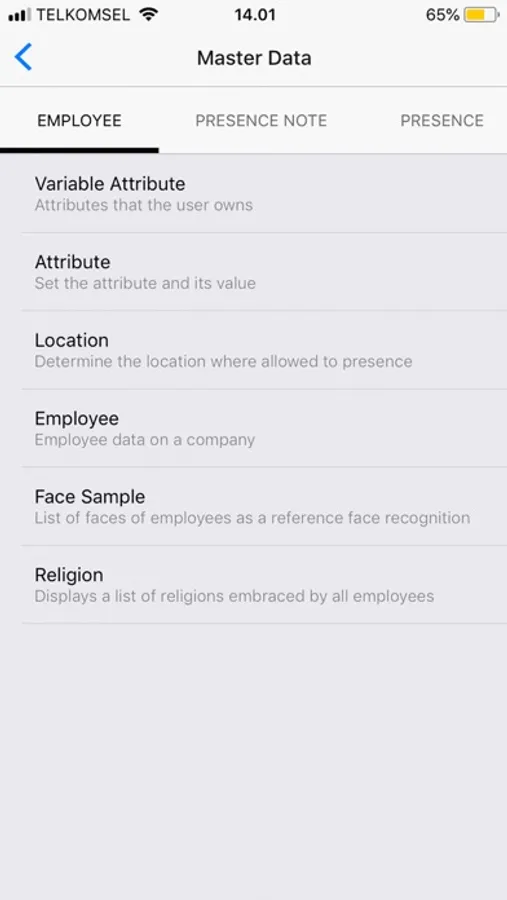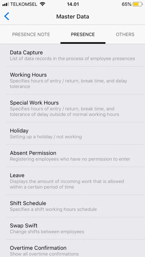 The application menu has features for CRUD manipulation of "Master Data" in some groups, "Employee" which includes data management attributes (groups), location (lat & long), employee data, and sample face sample. Furthermore, "Presence Note" includes processing of leave management & attendance note. "Presence" to process data on the application of the paired data capture app, working hours, holidays, leave, scheduling and overtime confirmation. "Other" process data slideshow, user access etc.