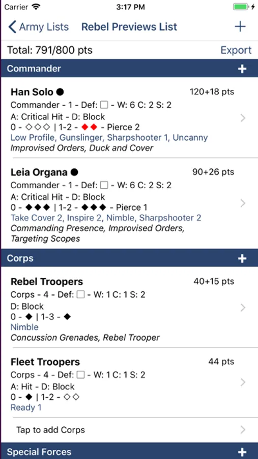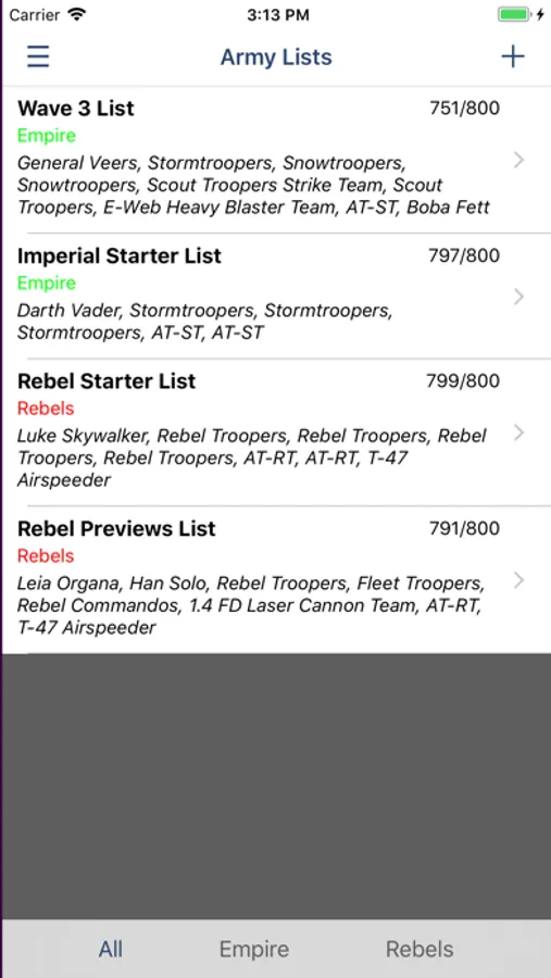 - Create and manage Rebel, Imperial, Republic, and Separatist army lists