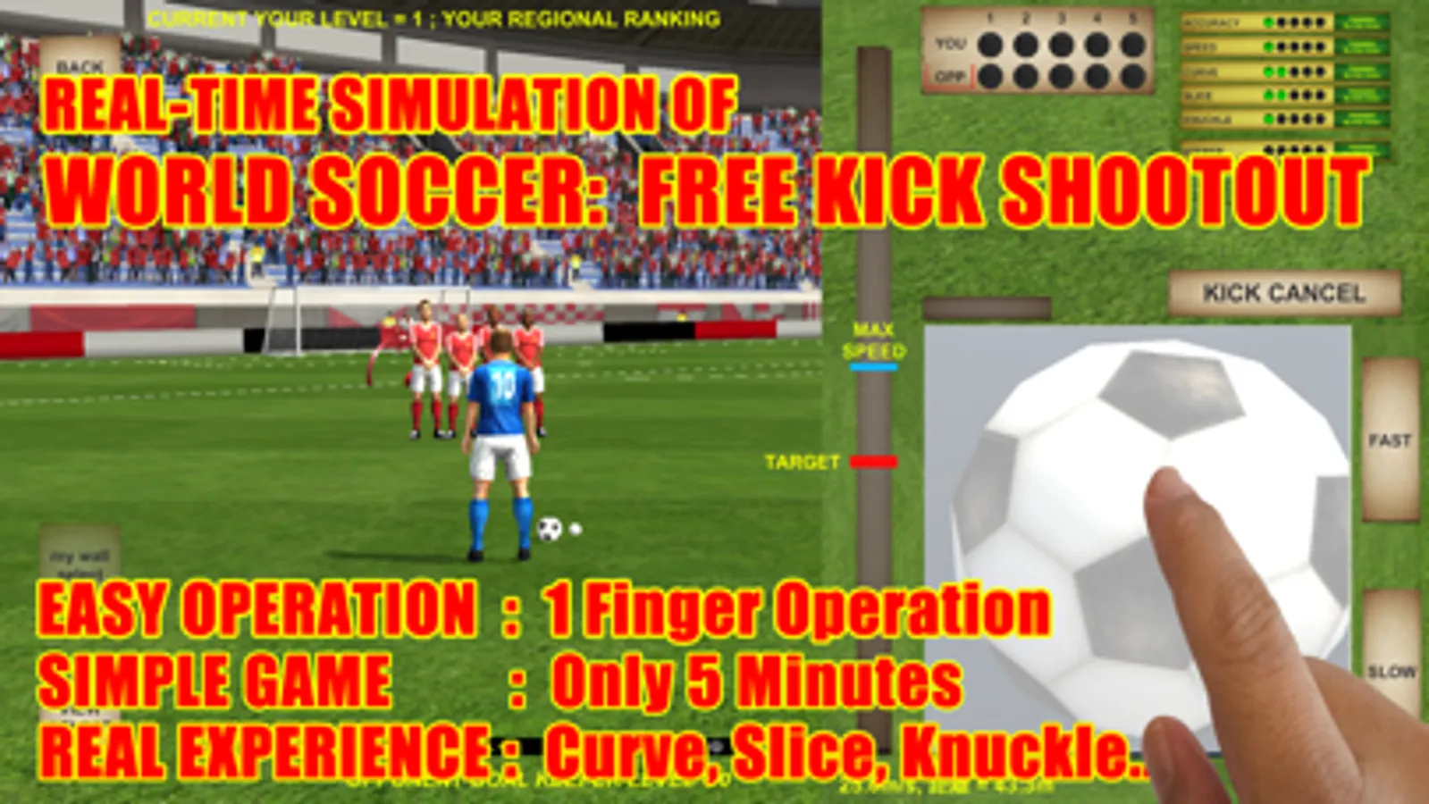 Soccer Free Kick game in the real-time simulation world. We prepared FK shootout, not PK shootout, a simple and easy battle in 5 minutes. Get 10 consecutive wins and aim for the world ranking number 1.
