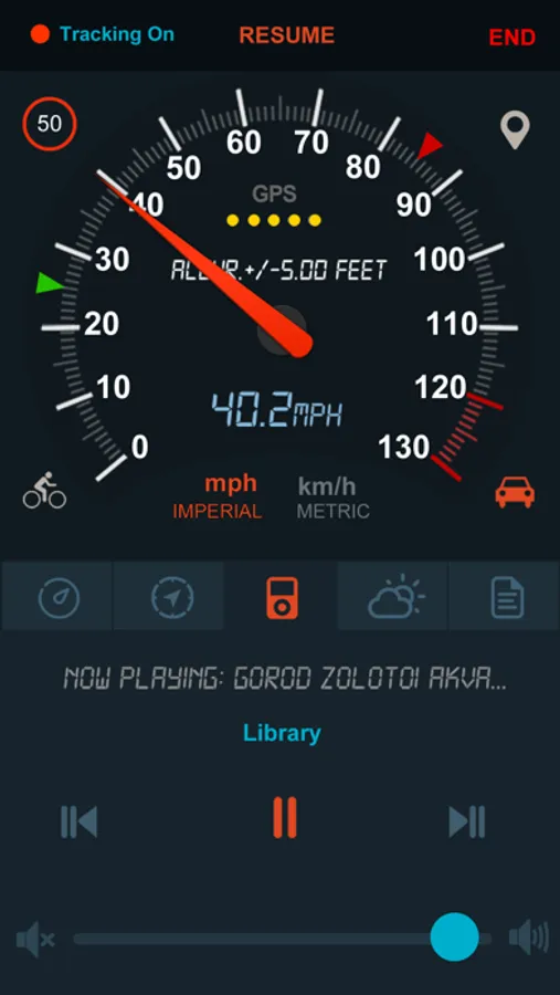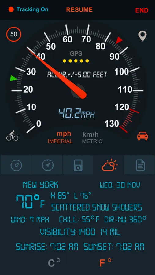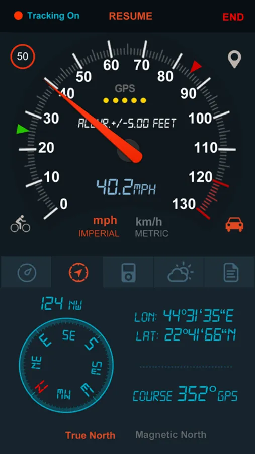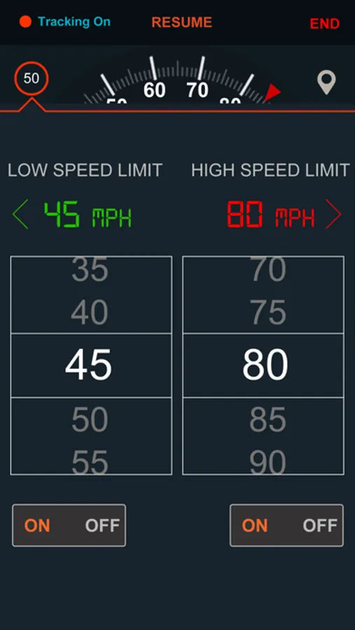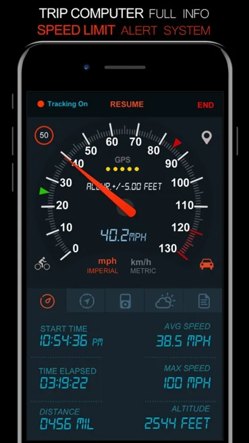 - Speed tracking in mph or km/h based on MPH or KM/H mode.