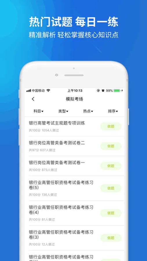 银行高管考试题库有模拟考场、历年真题练习、每日一练、快速练习、考点练习、考试押题、做题记录等多种学习与做题模式、丰富多样化的陪你一起考银行高管。