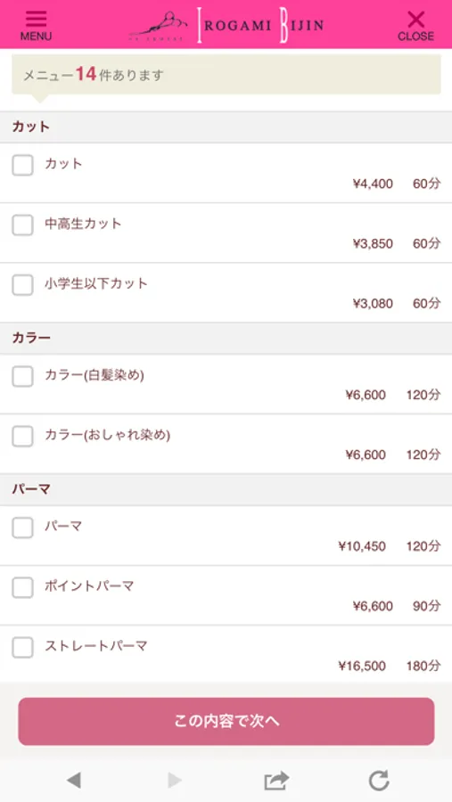 ご希望の日時やメニューを指定して送信するだけで予約を依頼できます。