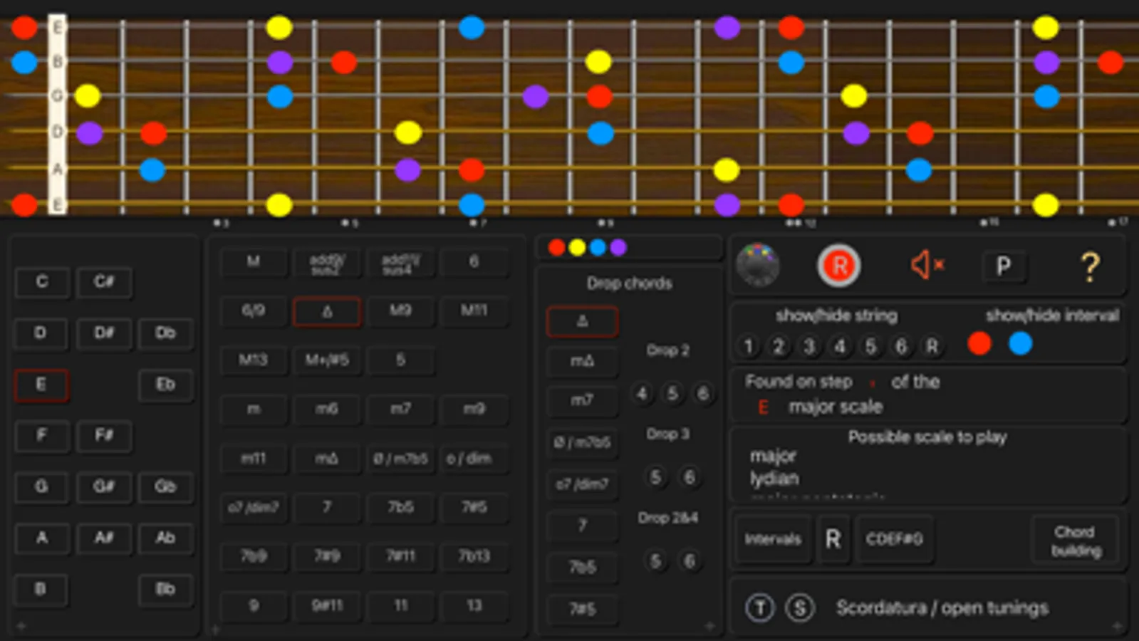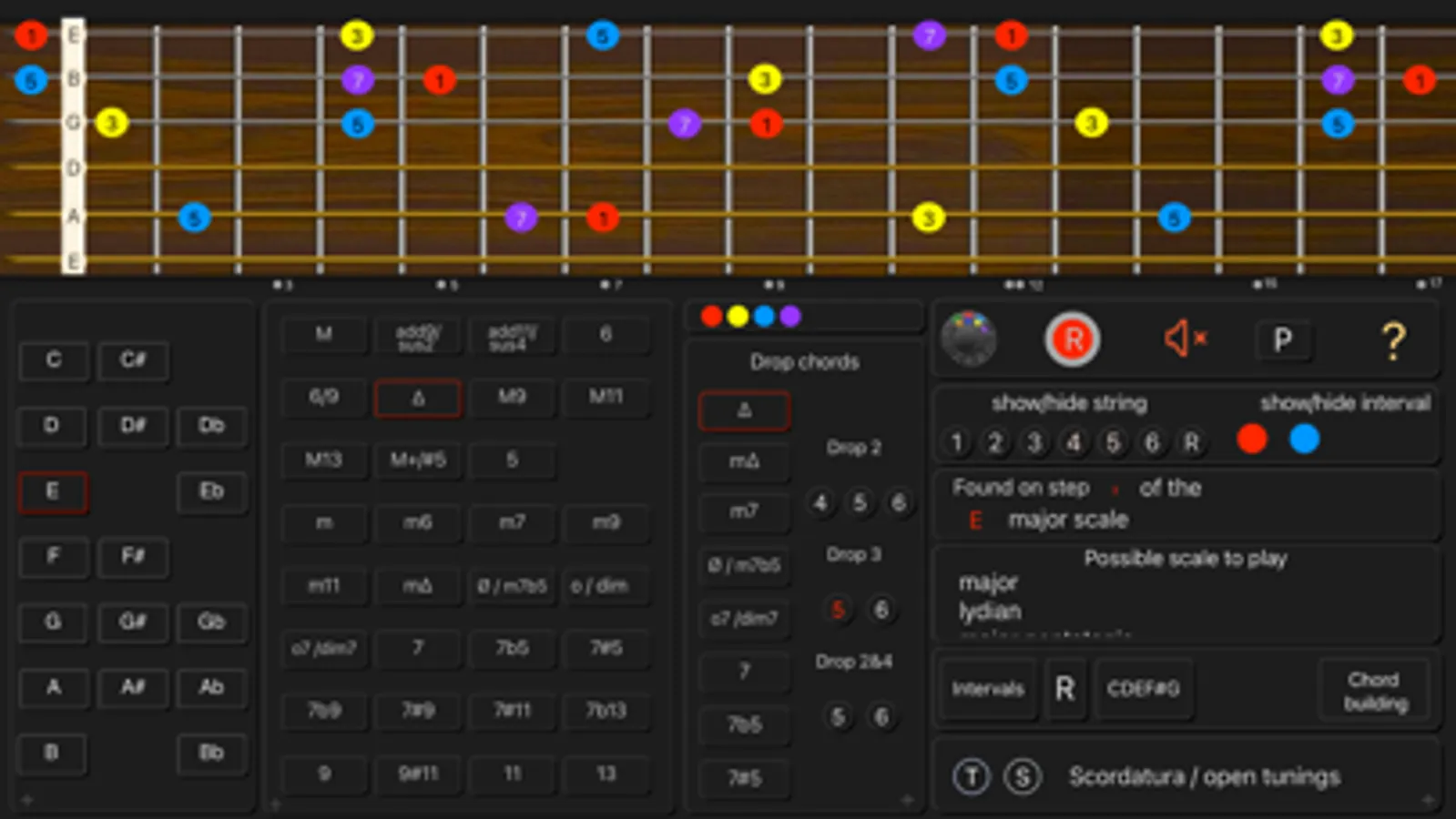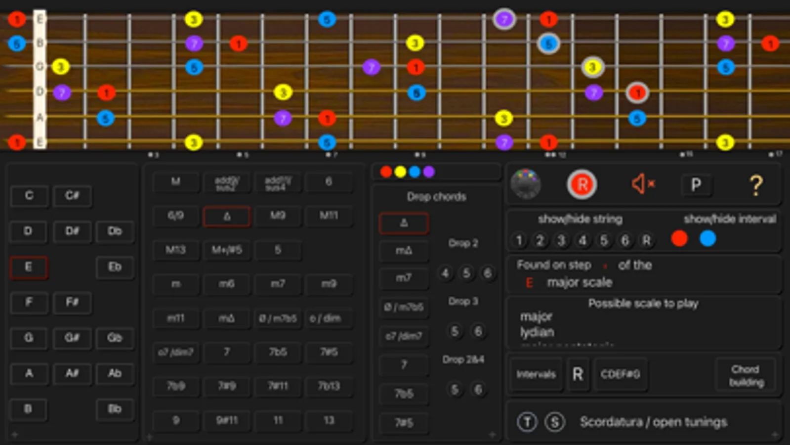 - See the names of the notes and the interval numbers on the neck