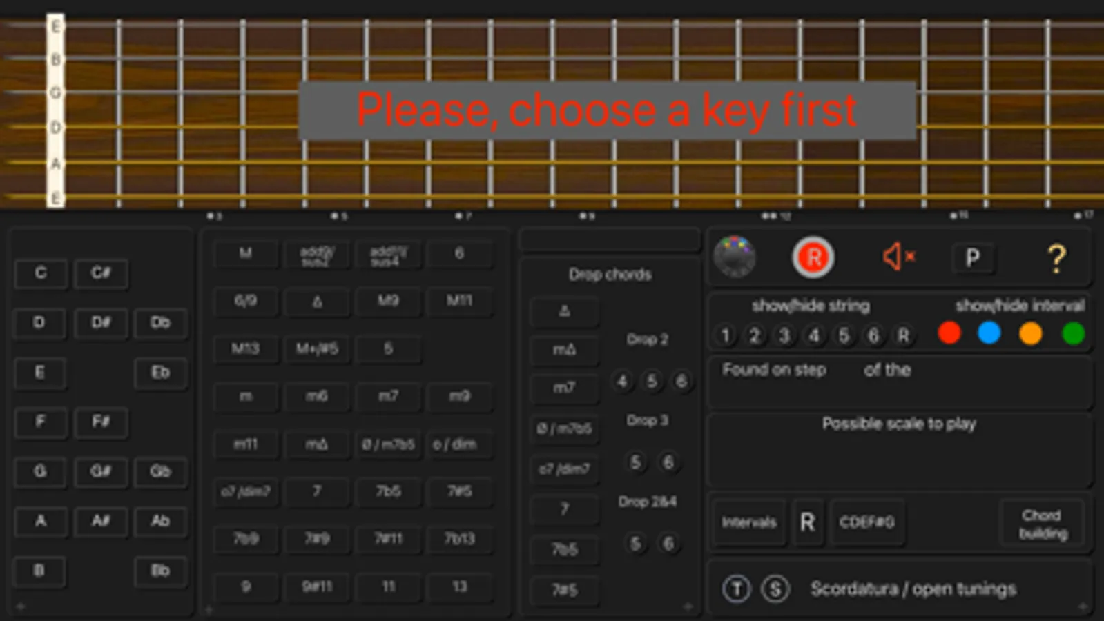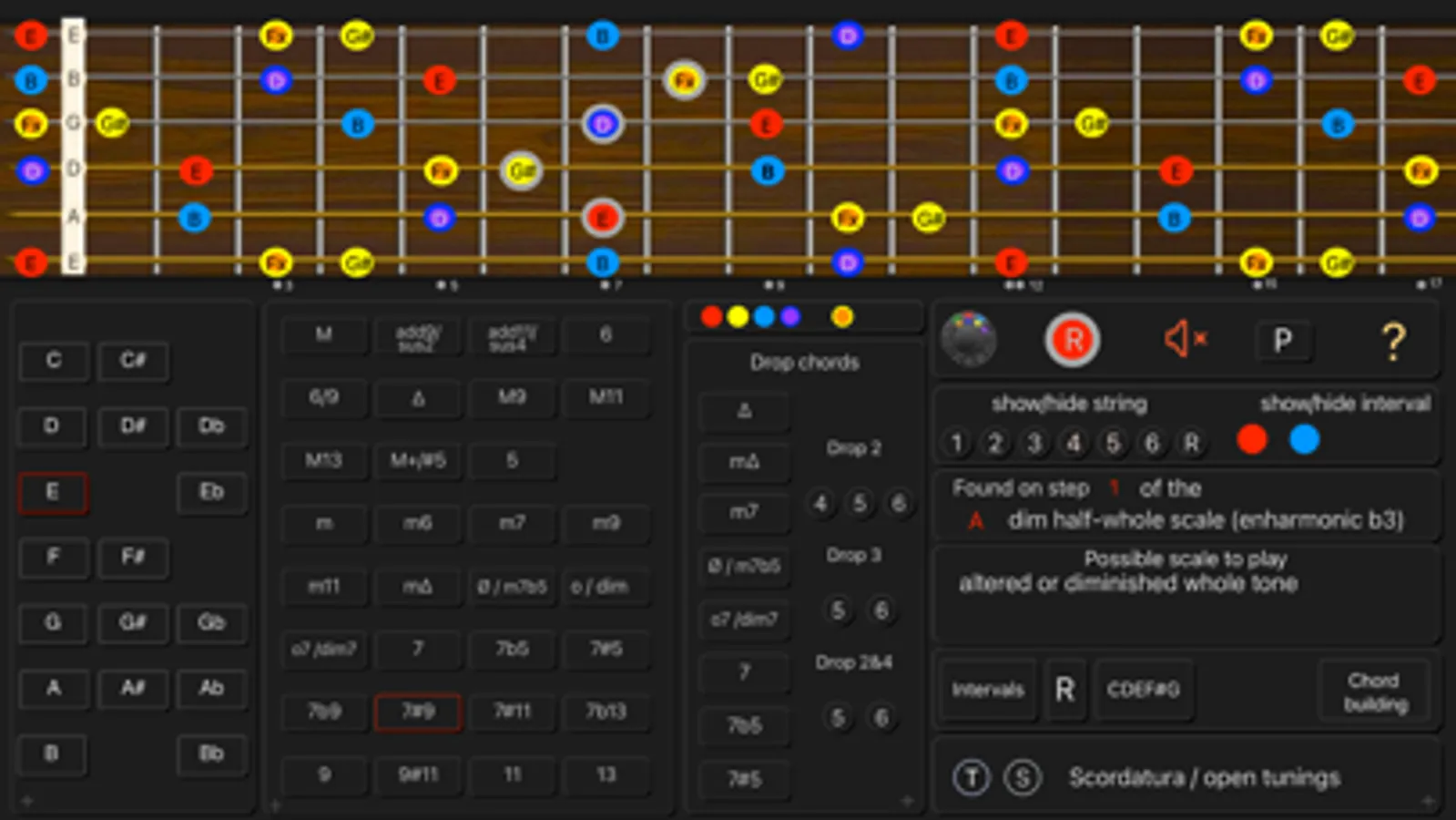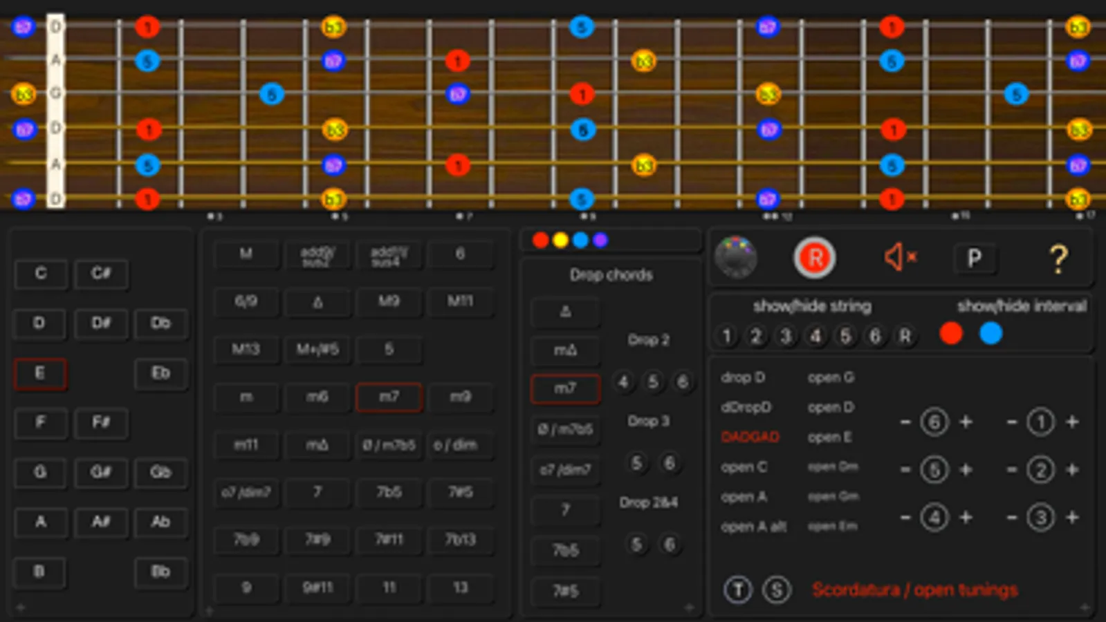- See the names of the notes and the interval numbers on the neck