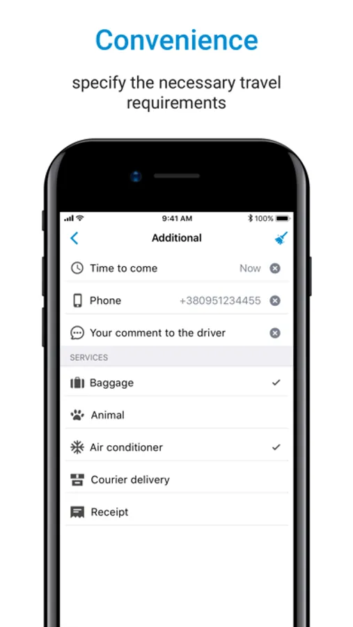 - ordering a car with additional services: "Baggage", "Animal", "Air conditioning", "Check";