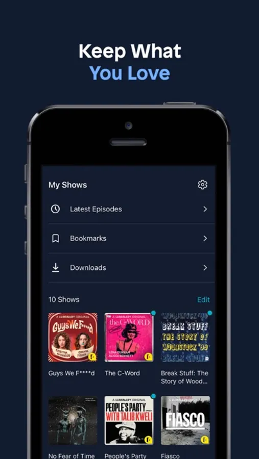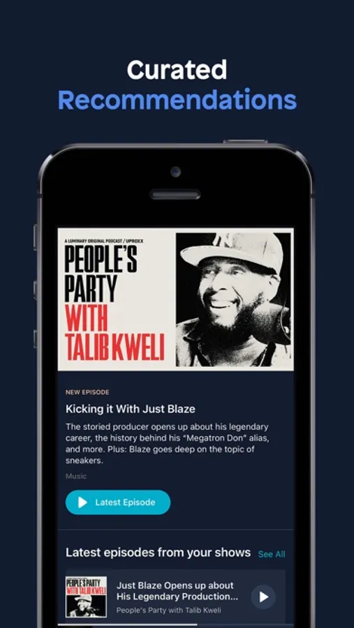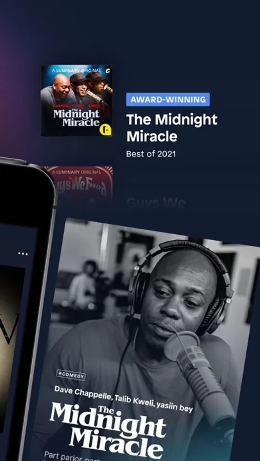 Access Luminary Original Podcasts you won't find anywhere else, like The Midnight Miracle with Dave Chappelle, yasiin bey, and Talib Kweli, The C-Word with Lena Dunham and Alissa Bennett, Spooked, Under The Skin with Russell Brand, The Roxane Gay Agenda, Til This Day with Radio Rahim, and many more. Plus special music experiences like the long-awaited return of Black Star, exclusive releases, and millions of the free podcasts and shows you already listen to and love.