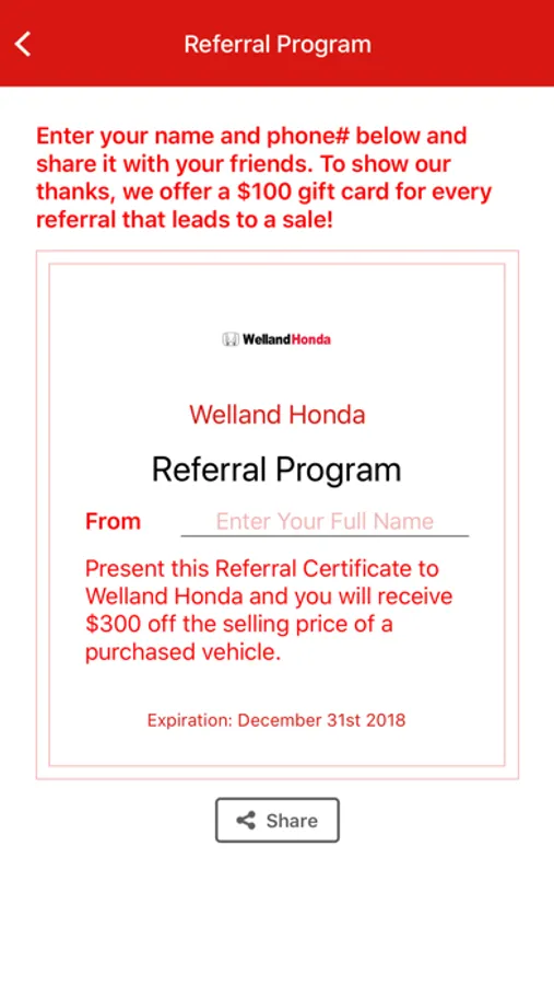 Welland Honda dealership loyalty app provides customers with an enhanced user experience. The mobile dealership app provide customers with relevant specials and loyalty offers. Key features include:
