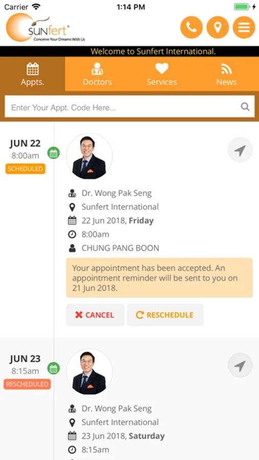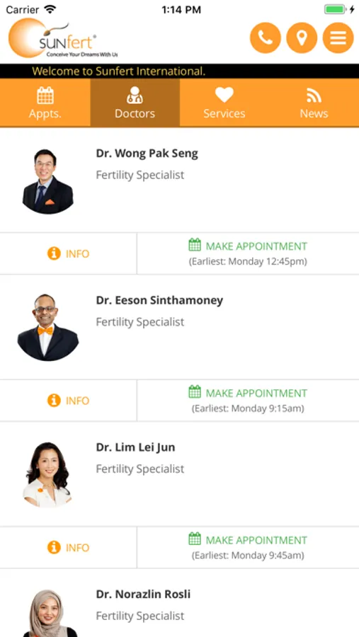 Sunfert International Mobile App aims to provide you the best experience to visit our fertility centre. It allows you to make appointments with our doctors or services easily. You can check the availability, choose your preferred arrival time, and even monitor live queue on your mobile phone.