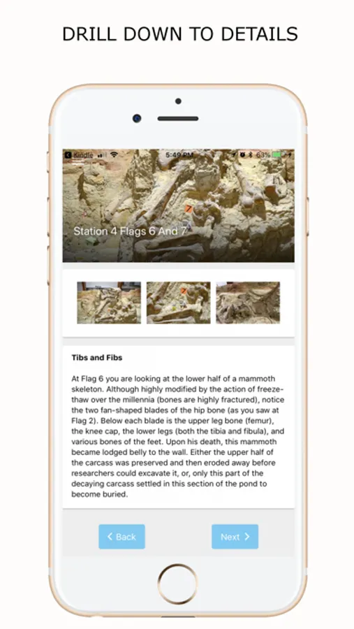 This app takes you through a short series of station stops along a ¼ mile long covered pathway around and through a now-dry sinkhole pond filled with mammoth skeletons. Each station stop provides detailed information about the active mammoth dig and helps you understand the hundreds of mammoth bones that you will see in front of you.