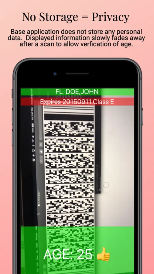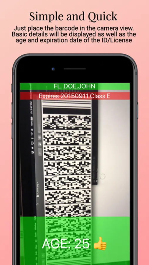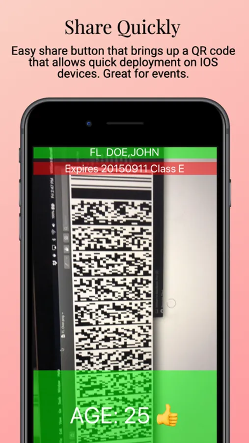 A simple 2D ID Barcode Scanner that quickly identifies over or under 21 based on the license barcode. No date math required. No limit on the number of scans. The application continuously looks for standard 2D Barcodes on US-based ID's and reports an over (Green/Thumbs Up) or under (Red/Thumbs Down) on any date of birth codes it scans. Designed for wait staff, club staff, bouncers, and bartenders to quickly and accurately determine an AGE based on the date of birth encoded on US-based licenses and passports. Can scan approximately 1 ID per second. It does not store data after the scan. Built-in QR code share app link function for deployment at events. Simply click the share button to bring a QR code up that other devices can use there normal camera app to go to the app link to purchase.