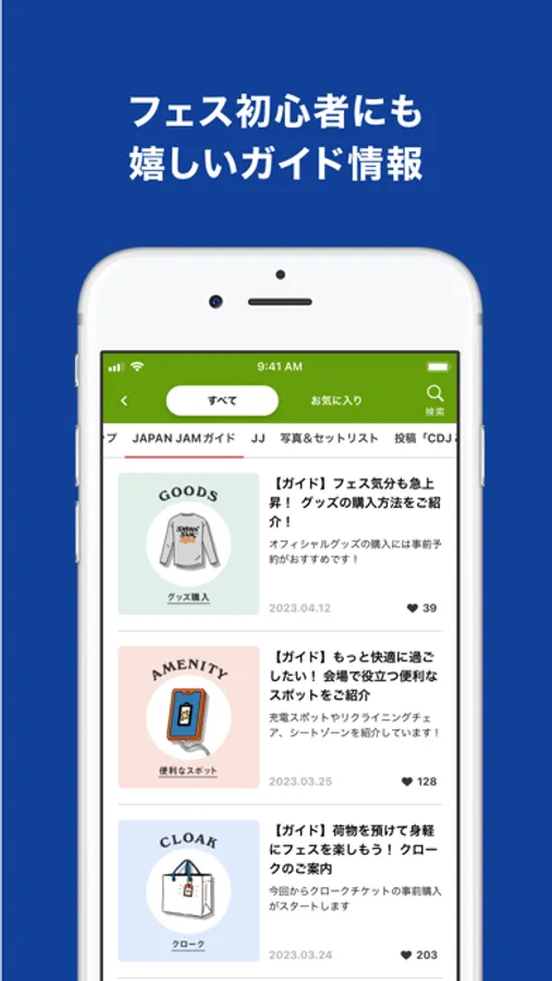 毎回好評のマイタイムテーブルや、飲食店、グッズ情報、エリアマップなど、当日役立つ機能ももちろん搭載。気になる飲食店やグッズをお気に入り登録したり、フェスの準備にもお役立ち。