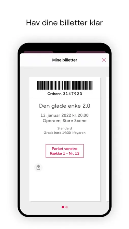 Alle dine billetter til kommende forestillinger er samlet i app’en. Hvis du skal i teatret med andre, har du mulighed for at dele billetterne med dine ledsagere. På den måde får du alle informationer om scene, tidspunkt, sædenummer osv. ét sted og I kan begynde at glæde jer til en tur i teatret.