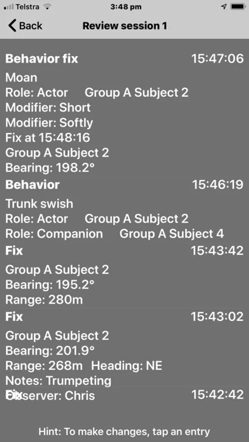 At any time during observations, or later, you can rapidly review and alter your recorded observations, including your voice notes or comments. Calculated data such as latitude/longitude will be adjusted appropriately.