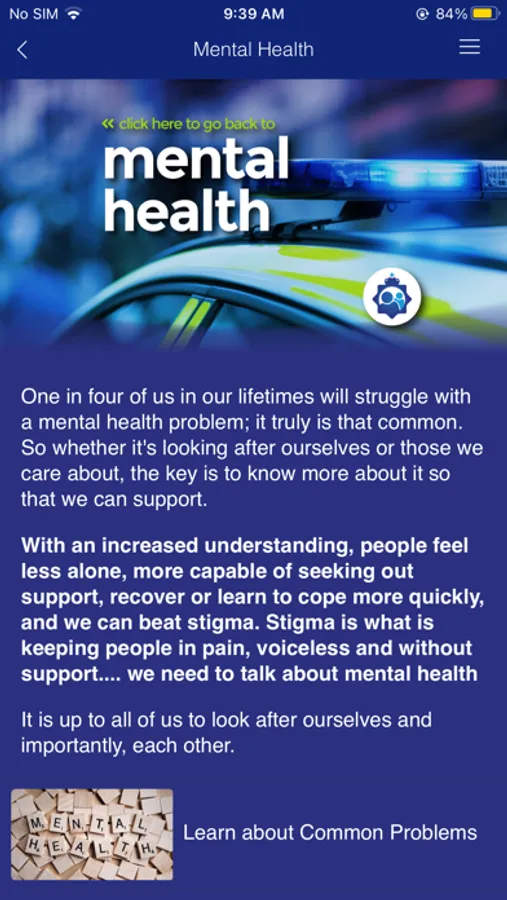 The App covers a range of problems faced by officers and staff in the Police service, such as anxiety, stress, PTSD (Post Traumatic Stress Disorder), depression, eating disorders, self-harm and more. It gives practical advice and support on how officers can maintain good mental health, spot warning signs for themselves and others, plus advice on how to get help for themselves and colleagues.