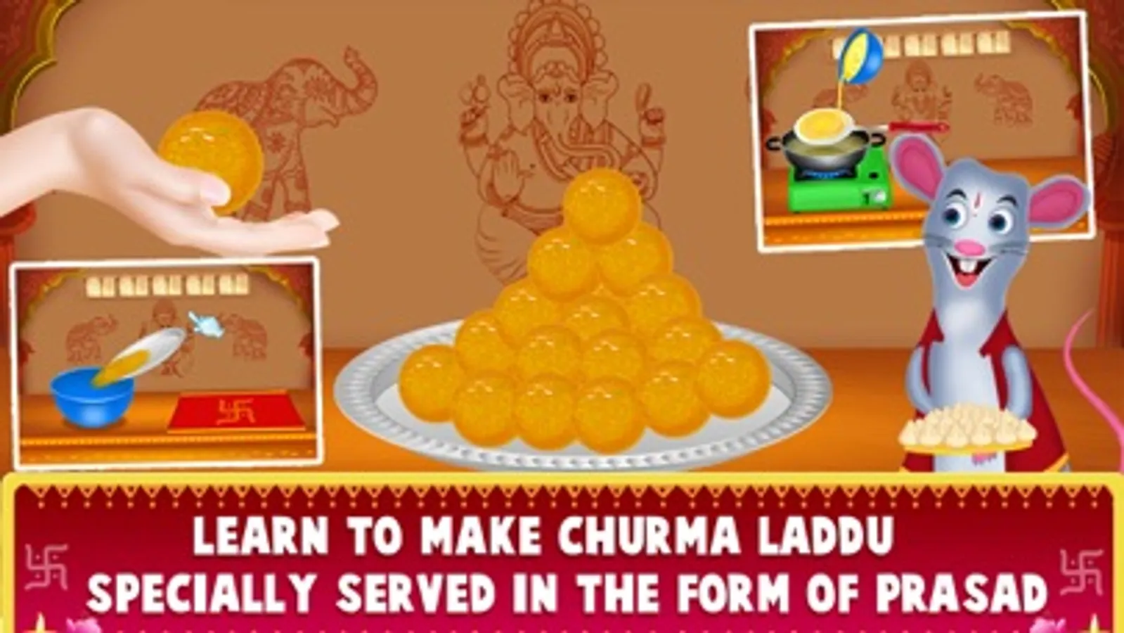 Help Ganesha in catching his favourite modaks and laddoos. Learn to make Churma laddu - specially served in the form of prasad. Play a devotional and fun mini game where different types of Laddus are falling from the sky and you have to catch it in Lord Ganesh's palm.