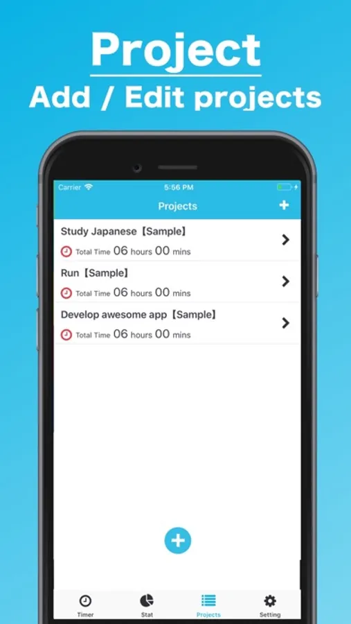This is the main function of this app. Please select projects and start the timer! Now, it's time to focus on your work! Don't forget to push Stop button after you finish it... You can close the app while you are working, the app record the time anyway!