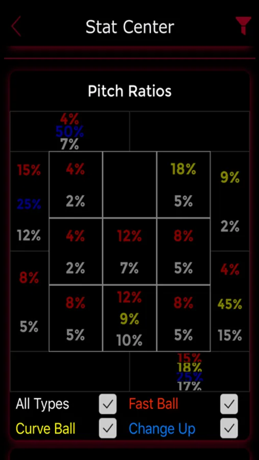 Last there is a Strike Out Tracker. The Tracker will provides a visual of where one may struggle when having 2 strikes. After collecting enough data users can start filtering their counts (0-0, 1-0, 2-0) hitters counts and even the other side of things with pitchers counts (0-1, 0-2, 1-2) and the even counts of (1-1, 2-2).