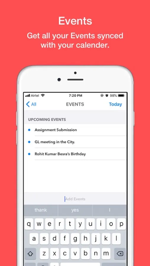 Events - Get all your events on the right side, synchronized with your calendar. You can easily add events right from the app.