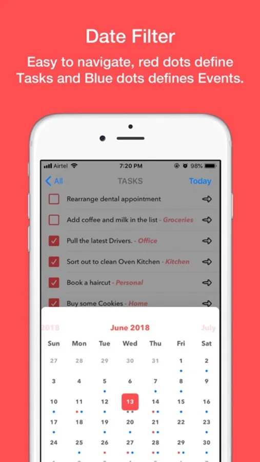 Notifier Marker - You can see Blue dot under Calendar for events and Red dot for Tasks.