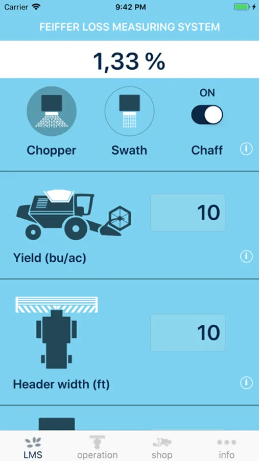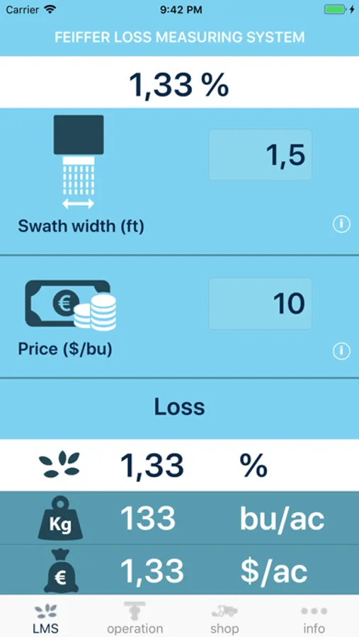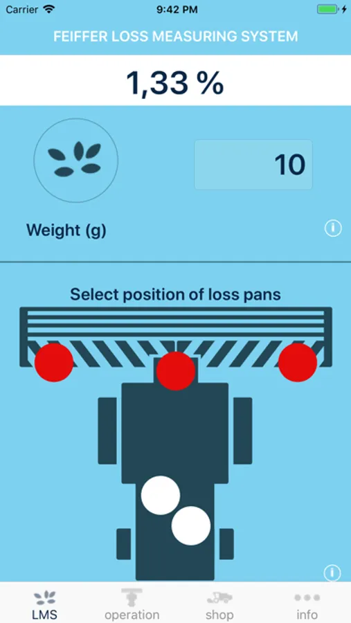 This app serves to calculate grain loss during the cutting and threshing. It helps you to avoid big losses, to calibrate the electronic loss control and to set up your combine harvester optimally. To use this app you need the LMS KIT (Loss Measuring System) from feiffer consult. And this is how it works: one to three loss pans can be fixed to the combine with flexible magnetic holders (possible over the entire working width). The test panels are automatically cast by remote control. Threshing losses are detected. A blower facilitates the separation of grain losses. The grains are weighed by means of a pocket scale.The result is input into the feiffer LMS app. An accurate loss value is calculated on the basis of the specific yield and the combine harvester parameters.