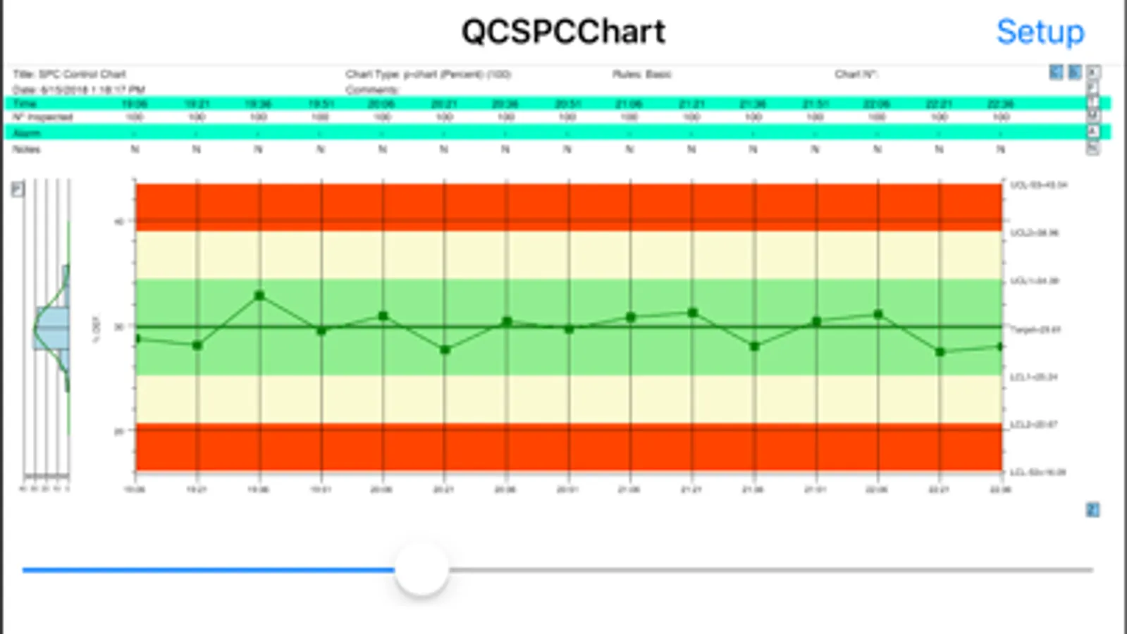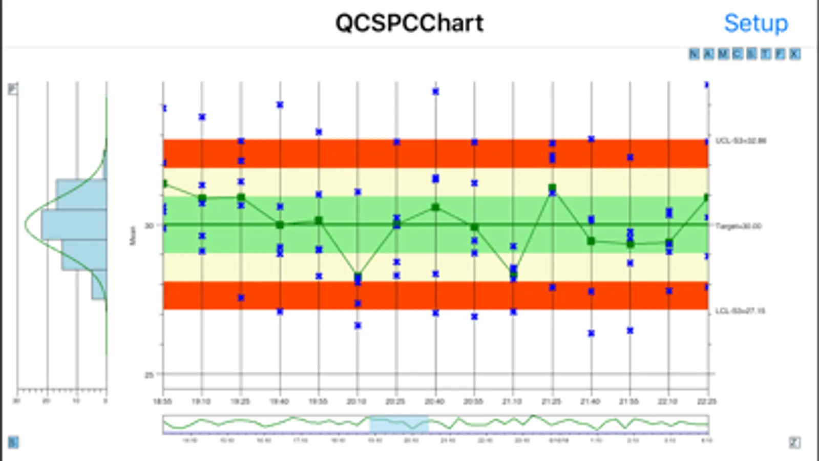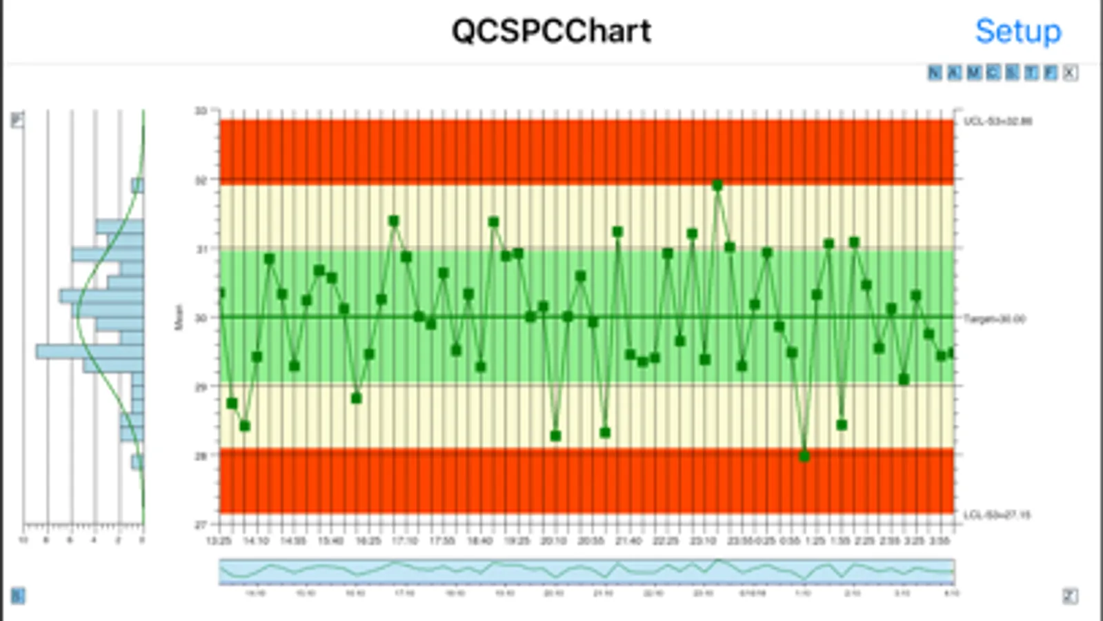 The QC SPC Chart software is an interactive SPC chart (6-sigma) application aimed at quality control professionals (and students) who want to view industry standard statistical quality control charts on their mobile devices. Typical users will monitor critical quality factors in manufacturing, process, and service industries, and display the results in one of the many supported chart types. Chart types include: variable control charts (XBar-R, XBar-Sigma, Individual-Range, and Median-Range), and attribute control charts for monitoring defects (p-, np-, c-, u-, and DPMO charts). The software will automatically calculate SPC control limits using historical data for the supported variable control chart and attribute control chart types. Alarms can be generated for standard +3 sigma control limits, or the WECO (Western Electric) rules. It will also calculate process capability ratios (Cp, Cpk) and process performance indices (Pp, Ppk). A set of specification limits can also be added to the chart.