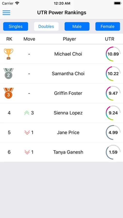 -View UTR Rankings list