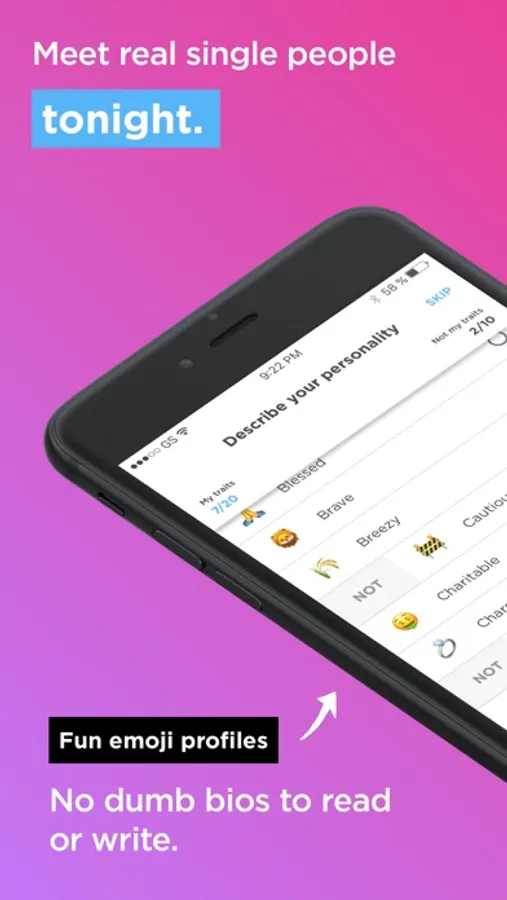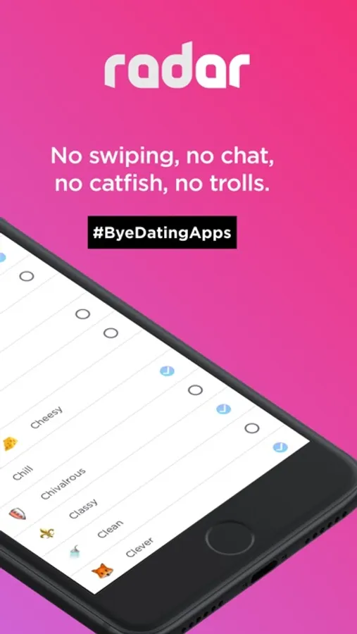 • No dumb bios. Can we all agree no one wants to read or write a self-summary? Radar has easy emoji profiles that describe your personality and interests.