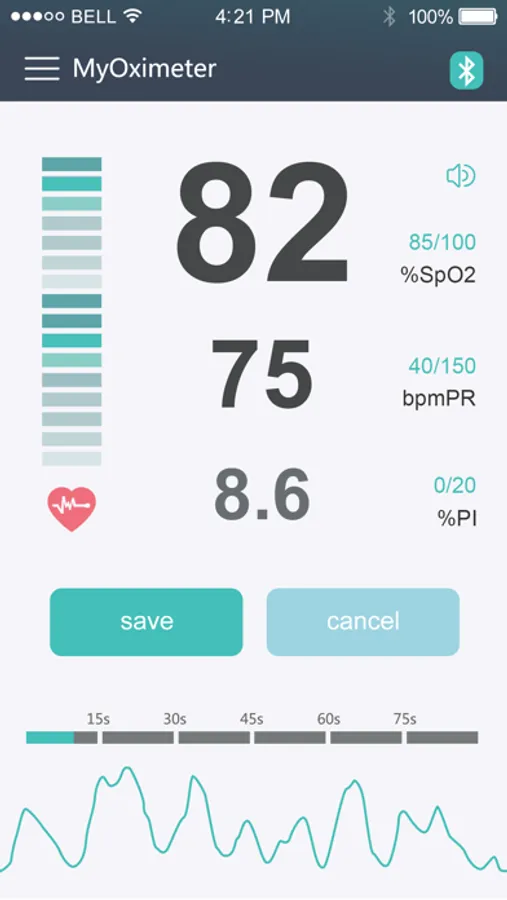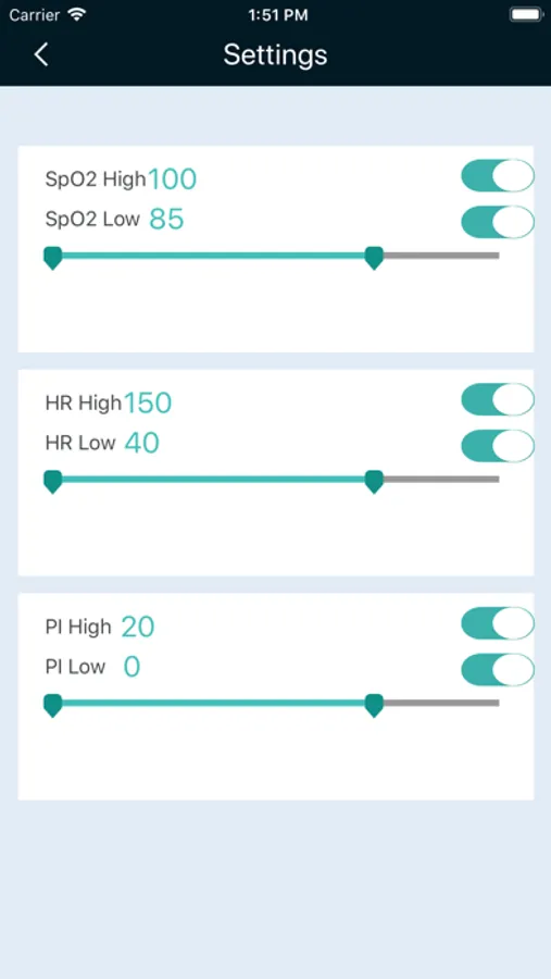 The maximum and minimum value of PR, SpO2 and PI can be setted. This app features an audible alarm to let you know when values are too high or too low.