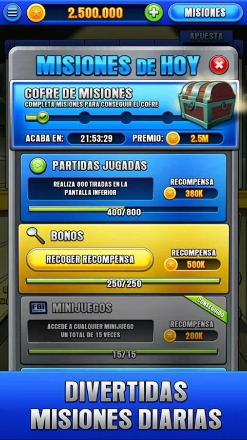 ¿Qué son las misiones? Todos los días hay de tres a seis misiones a superar en la Tragaperras.