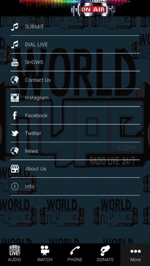 AUDIO, VIDEO, Call Live, SUBMIT MUSIC, Contact Us, News, DIAL LIVE, Instagram, FB LIVE, Twitter, About Us, Map, Photos