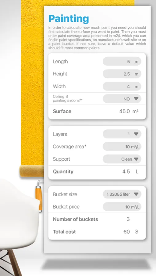 More than 30 different options, works, calculations, optimized for both metric and imperial units, for different standards Calculate coverage areas, spacing, required amount of work material and cost for each piece or box of materials to give you an excellent estimate for your works and help you save money. Each calculation is designed to give you additional information or help you think about details you might have overseen in your planning so you don't have to worry about anything!