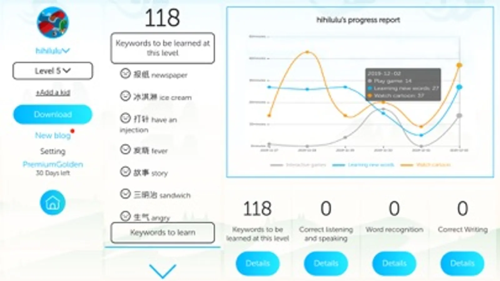 Parents can check Progress Details report and monitor kids' Chinese learning progress at any time!