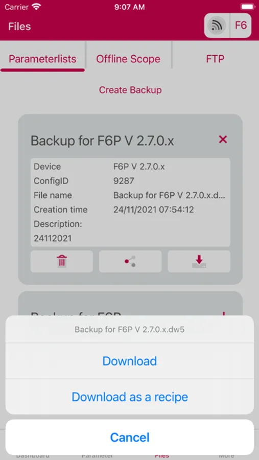 - Create and send backups of the parameter list