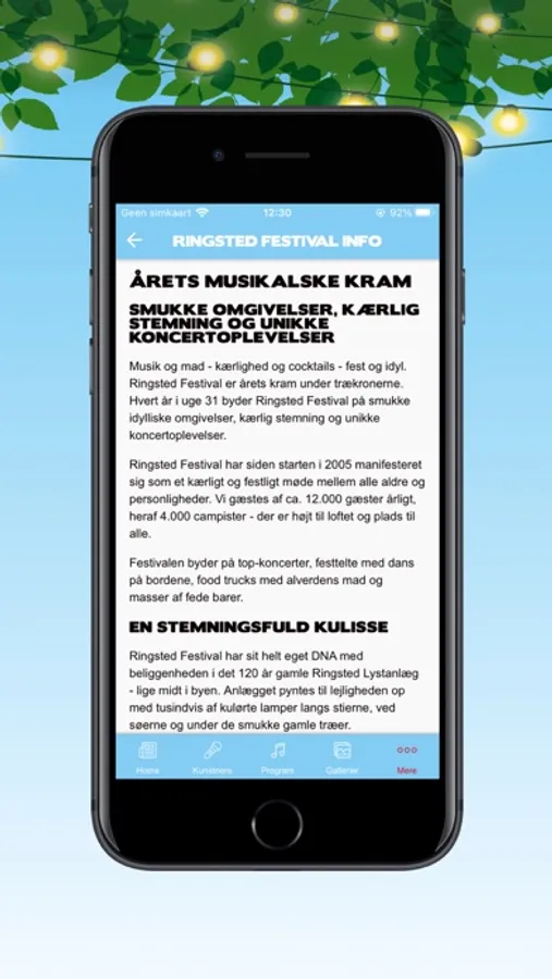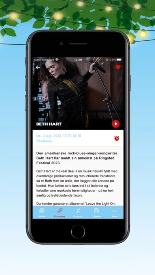 Appen er en genvej til alt du har brug for, når du skal på Ringsted Festival. Her kan du se, hvilke kunstnere, der spiller på årets festival. Du kan se hvornår de spiller og på hvilken scene. Du kan give dine yndlingskunstnere en stjerne - så modtager du en notifikation inden deres koncert. Tryk på musikikonet og hør en smagsprøve på kunstnernes hits.