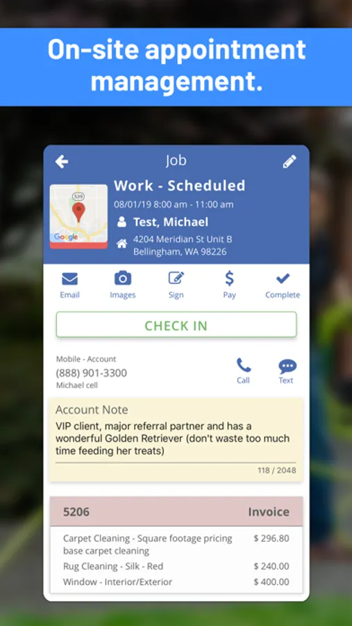 Check in and out of jobs easily, take photos on-site, contact customers, collect signatures, and edit work orders all from one screen.