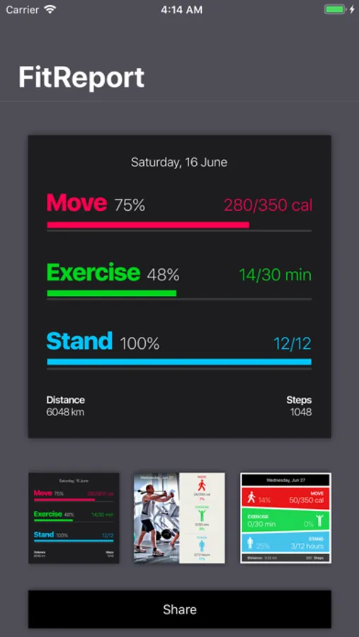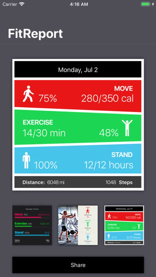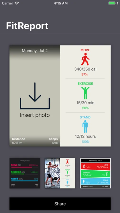 FitReport was created to give more fun and beauty to your fitness reports. You can choose on of our designed templates and share your activity data with your friends on social networks. Also, you can pick one of your exercise photos and add it to your report so it makes it more personal.