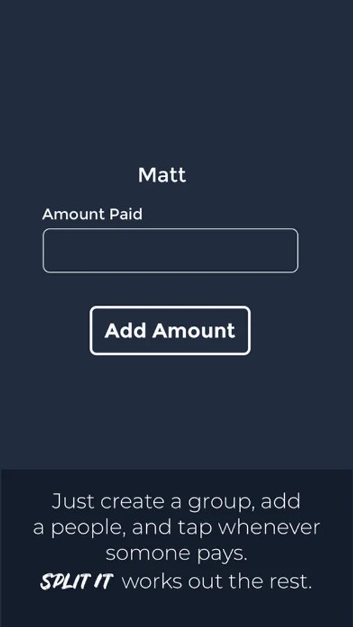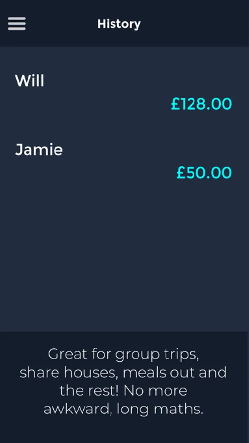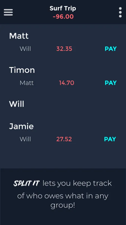 Super easy, just add a group, add some people. When one person buys something for the group - hit their name and add in the amount. At then end, see who owes what.