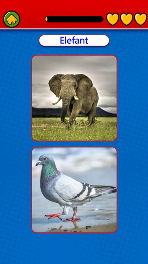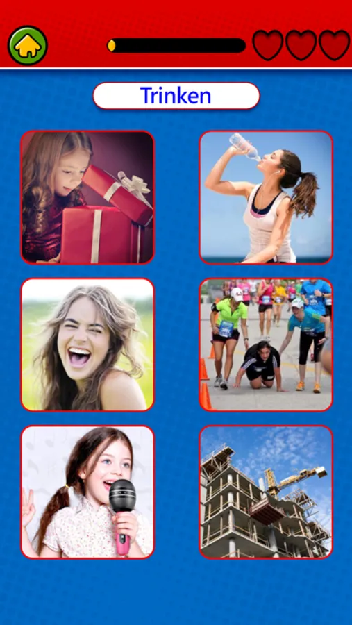 So, Game to learn german vocabulary has 2 fun game. In game, you can practice phonics German, help you remember vocabulary better. One word will be automatically pronounced, you have to listen what is it, then choose true image by touching screen.