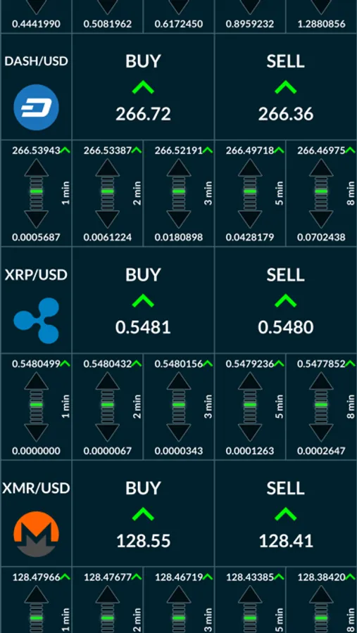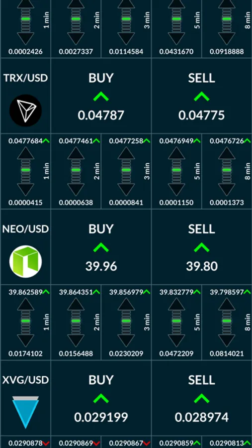 CoinSignal shows you multiple levels of ema(expotantial moving average) 1 minute, 2 minutes, 3 minutes, 5 minutes and 8 minutes based on fibanocci array. With the help of our application you will be able to see how strong the bull trend is picking. or how hard is the bearish fall.