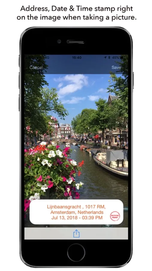 Picture Proof is a great photo app, easy and fun to use. Open the app, take a picture, and voila, the address, date and time are displayed directly on the image. Save the photo if you like it, or cancel to retake it. Send it to friends, family or colleagues, all sharing options are available – social media, email or message.