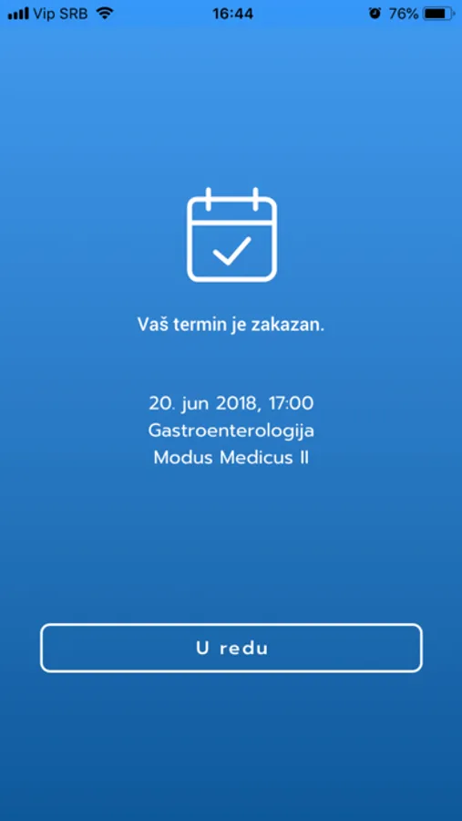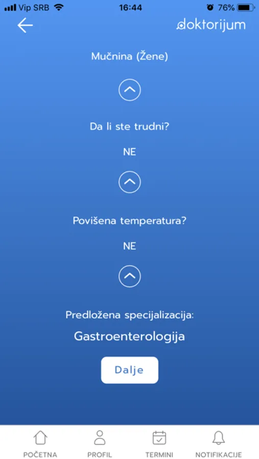 Kroz nekoliko koraka, naš algoritam Vam može dati predlog specijalizacije koja najviše odgovara Vašim simptomima. Odaberite Nelagodnost ili Bol i odgovorite na nekoliko pitanja. U zavisnosti od specijalizacije, u aplikaciji će Vam se izlistati ustanove u kojima možete zakazati termin prema odabranom datumu i lokaciji. Nakon odabira željene ustanove i termina, dovoljno je da kliknete na dugme "Zakaži". Automatski ćete biti upisani u zakazane termine ustanove. Vaš termin uvek mošete proveriti u aplikaciji na strani Termini.