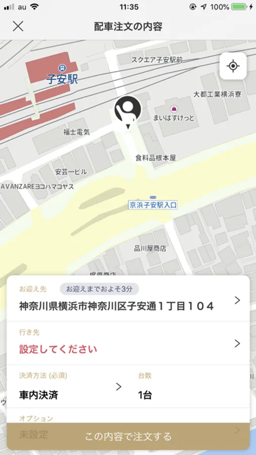 地図上で乗車場所を簡単に設定できます。場所を選んで、配車ボタンを押すだけ。オプションで決済方法、配車台数、降車場所など必要に応じて設定することもできます。