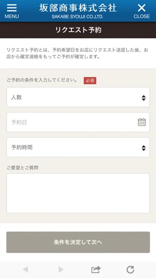 希望の人数・日時を指定して送信するだけで予約を依頼できます。