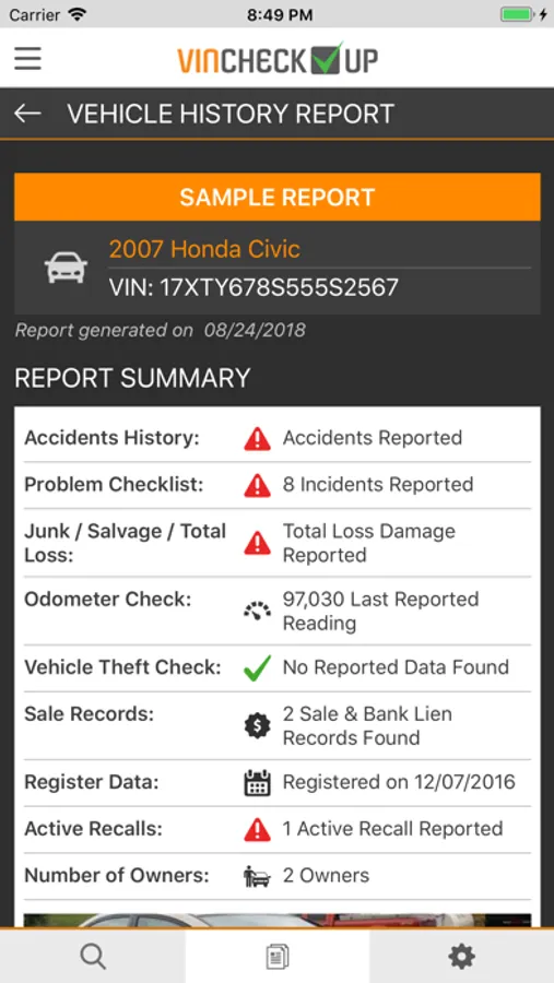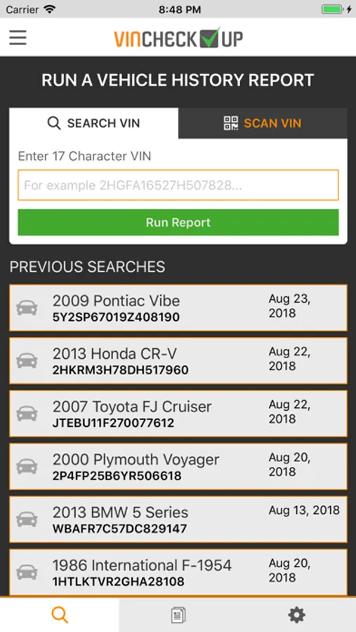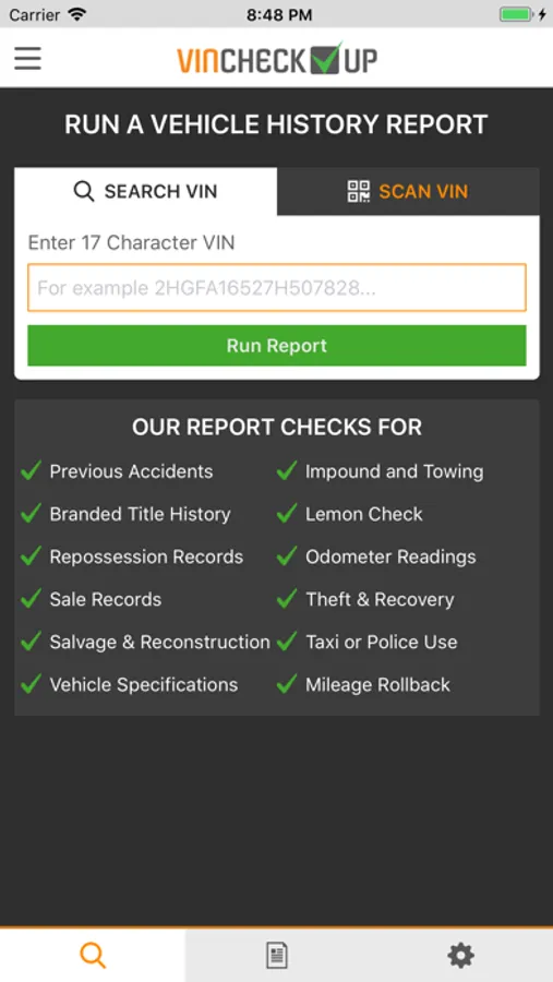 VINCheckup is an information product that provides users with easy and inexpensive Vehicle History Reports. Our reports can provide users with detailed vehicle specifications along with vehicle Accident History, Salvage and Total Loss events and much more...